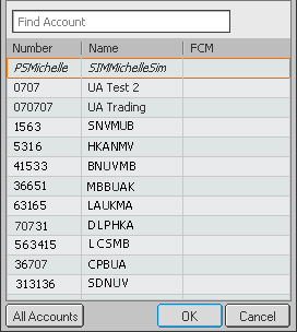 CQG Trader introduces a better way to switch between accounts with the Account Selector. The Account Selector, seen here with dummy account information, is opened by right-clicking the DOMTrader or Order Ticket title bar.