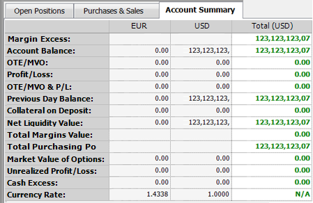 Depending on those preferences, these values can be updated automatically or manually (by clicking the Account Summary tab). Automatic updates occur only if the Account Summary window is active. The values are updated when you switch to the Account window from another window; when a fill, fill busted, or fill cancelled transaction occurs; when a day statement environment change occurs; when a current balance environment change occurs; and when the quantity of working orders changes.