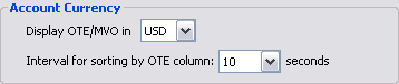 Choose the currency to be used in OTE calculations. This setting applies only to the Orders and Reports Account Summary window and the title bar of the Orders and Report window. Other controls and windows use US dollars for open trade equity, unrealized profit/loss, market value of options, and profit/loss.