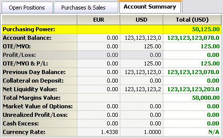 This window displays balances of account-related categories, such as purchasing power, OTE/MVO, and P/L. Please note that if you have all accounts selected, then accounts are listed vertically, and the balances are listed horizontally.